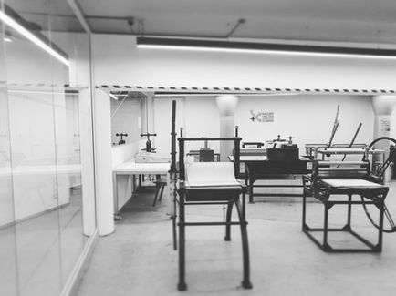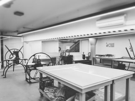 A fully equipped printmaking studio designed for experienced and emerging printmakers. This studio includes three printing presses, a screen-printing one-arm bandit, an etching hot plate, a dual-purpose exposure and vacuum unit, screen printing coating facilities, and two book presses. Named after renowned printmaker Elizabeth Rooney, this space is dedicated to supporting printmaking as an art form. It regularly hosts term-long printmaking courses, masterclasses, and artist-in-residence programs.